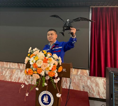 (图2 麦星匠创始人黄梅荣携碳纤维机械鹰亮相校园,在演讲会上引起师生的震惊。)